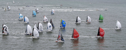 Les spécialistes de la voile olympique ont à l’occasion fait la preuve de leur art du départ, puisque, à la côte, Frédéric Duthil (Technique Voile) et Pierre Leboucher (Guyot Environnement) ont été parmi les plus véloces à couper la ligne, avec à leurs côtés Xavier Macaire (Groupe SNEF), Gildas Mahé (Breizh Cola), Thierry Chabagny (Gédimat) et Alan Roberts (Seacat Services). Ce dernier, deuxième du prologue URGO mercredi dernier, prenait ensuite les commandes à la bouée de dégagement avant de franchir en tête les trois marques de parcours suivantes, la cardinale Grande rade Sud, la bouée spectacle devant la plage du Havre et la bouée Radio France, la cardinale Octeville Ouest, franchie après une heure et demie de course. A ses trousses, on jouait des coudes avec dans l’ordre Gildas Mahé, Xavier Macaire, Frédéric Duthil, Tanguy le Turquais (Everial), Eric Péron (Finistère Mer Vent), Hugh Brayshaw (Kamat), Thierry Chabagny et Vincent Biarnes (Baie de Saint-Brieuc).