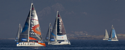 Dans un premier temps, le jeune Pierre Quiroga (Skipper Espoir CEM-CS) a fort bien manœuvré en se glissant le long des falaises galiciennes, à peine la ria de Muros de Noia avalée : il n’y avait alors que rien dans l’air et il fallut patienter une bonne heure avant que les étraves ne s’ébrouent. À ce stade, Gildas Mahé (Breizh Cola) menait au centre du plan d’eau quand Sébastien Simon (Bretagne CMB Performance), Xavier Macaire (Groupe SNEF) ou Alexis Loison (Custo Pol) étaient franchement empétolés un peu plus au large.