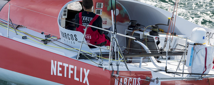 Netflix sort de l’écran en soutenant le bateau du Britannique Sam Goodchild sur la Route du Rhum - Destination Guadeloupe. Pendant toute sa traversée de l’Atlantique, le skipper sera accompagné par les visages des deux personnages principaux de la série (un narcotrafiquant et un agent de la DEA) portés par sa grand-voile. Jamais encore une série n’avait mis un pied dans le monde de la voile.