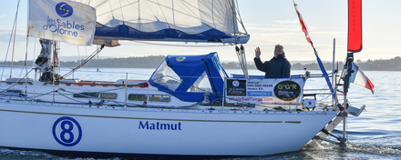 1. Jean-Luc Van Den Heede, Rustler 36 Matmut : 2 150 milles de l'arrivée, vitesse moyenne 2,9 noeuds.