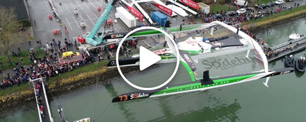 Deux semaines après sa sortie de chantier, le Sodebo Ultim 3 a enfin touché l'eau devant le hangar Multiplast à Vannes, lundi 18 mars dans l'après-midi, sous une pluie fine. Ce qui n'a pas empêché des centaines de personnes de venir assister à la délicate manoeuvre. La mise à l'eau s'est déroulée sans aucun problème et il a rejoint dans la soirée son port d'attache à la Trinité-sur-Mer.