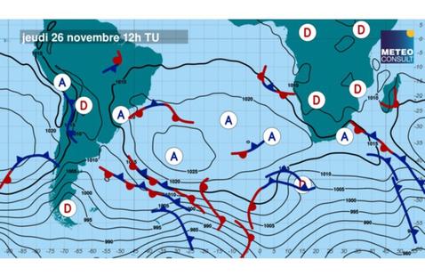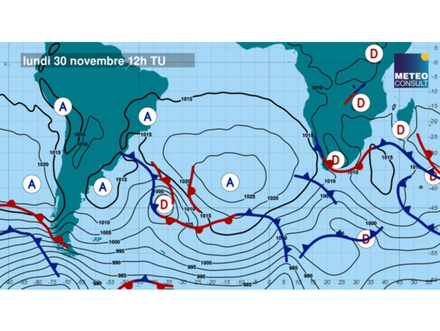 Sur la carte synoptique de lundi prochain, et même si la fiabilité est encore limitée à cette échéance, on voit que les hautes pressions s’étalent très largement entre l’Afrique du Sud et l’Amérique du Sud. Le centre de l’anticyclone est positionné très au sud par rapport à sa position habituelle, une situation déjà rencontrée par les skippers du Vendée Globe… Il leur faudra dès lors surveiller les dépressions se creusant régulièrement au large des côtes sud du Brésil, pour espérer trouver le bon trou de souris pour faire une route la plus directe possible vers le Cap de Bonne Espérance, en se faufilant en bordure de l’anticyclone. Encore difficile de prévoir si cette opportunité se présentera, une aventure passionnante à suivre…