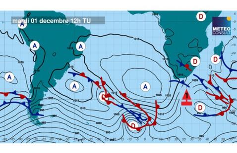 La carte synoptique ci dessous met en évidence le couloir dans lequel Sodebo devra s'engouffrer entre les systèmes dépressionnaires établis au large de l'Uruguay et de l'Argentine et la zone de hautes pressions tentaculaire qui barre la route en direction du Cap de Bonne Espérance. Si les skippers auront un vent de nord-ouest soutenu étant donné l'important gradient de pression, le détour est important pour aller chercher le passage vers l'Océan Indien...