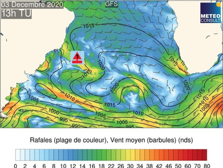 Avec un anticyclone de Sainte-Hélène s'étalant très largement sur l'Atlantique sud, c'est un véritable obstacle qui se dresse sur la route des navigateurs. A noter sa position plus sud qu'habituellement ce qui nécessite de faire une route un peu plus longue pour aller chercher le flux d'ouest océanique en place au sud de l'anticyclone.