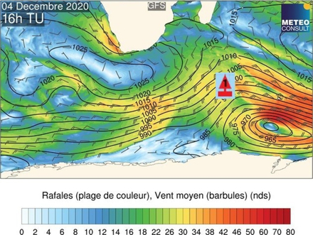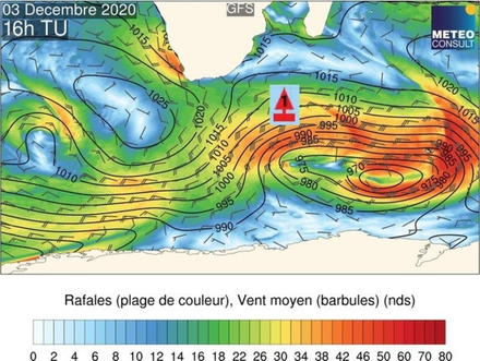 Ce vendredi 4 décembre, la tête de course sera à la poursuite du front froid afin de glisser le plus rapidement possible vers le sud-est. L’anticyclone de Sainte-Hélène n’en finira plus de gonfler vers l’est jusqu’à la porte de l’Océan Indien. Les poursuivants seront bloqués dans leur progression face à cette masse anticyclonique qui réduira considérablement leur vitesse, d’autant plus qu’ils n’auront que peu de marge de manœuvre car une route trop au sud les mèneraient dans la zone d’exclusion.