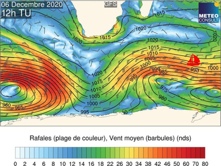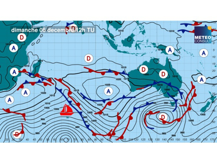 Les conditions météo resteront encore très agitées la semaine prochaine avec notamment lundi un front froid très actif qui devrait traverser les skippers de tête. Il apportera de fortes pluies et des rafales tempétueuses de nord-ouest de plus de 50 nœuds. Enfin, il n’est pas impossible que certains skippers passant au nord des îles Kerguelen lundi et mardi voient tomber de la neige puisque les températures chuteront après le passage de ce front.