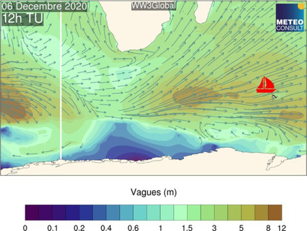 Sur la carte ci-dessus, on peut voir que la tête de course basculera progressivement dans des vents d’ouest forcissant jusqu’à 30 nœuds de moyenne et avec des rafales pouvant dépasser les 40 nœuds. Les poursuivants des groupes 2 et 3 devraient rattraper leur retard grâce à un flux d’ouest à sud-ouest particulièrement marqué dans un couloir étroit allant du 42ème au 45ème parallèle puisque les skippers ne pourront aller trop au nord en raison de l’anticyclone et trop au sud en raison de la zone d’exclusion. La mer restera toujours aussi forte pour la tête de course avec des vagues entre 5 et 6 mètres (carte ci-dessous). La mer sera un peu moins forte pour les poursuivants avec des vagues entre 3 et 4 mètres.