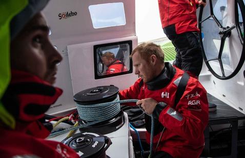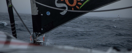 Les conditions sont engagées, faisant dire lundi à Matthieu Vandame, barreur/régleur : « Il y a 30 nœuds établis, pas mal de mer, il fait très froid, ça va très vite, ça bouge énormément, il faut sans cesse se tenir. »