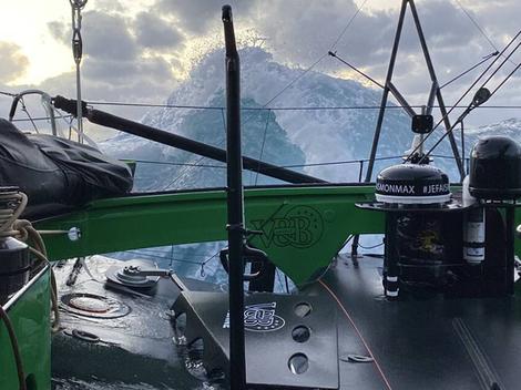 Quel est le tableau autour de toi ? “Le paysage est assez irréel. C’est comme dans les pires films de tempêtes. C’est ouf la mer est défoncée ! J’ai eu une rafale jusqu'à 64 nœuds (118 Km/h)… Je n’avais jamais connu ça ! Je savais que j’allais voir de fortes houles avec de grands surfs, mais je ne pensais pas naviguer dans une mer qui empêche d’avancer. On ralentit pour ne pas casser et malgré cela V and B - Mayenne garde des vitesses élevées avec des pointes à 25 nœuds. Le bateau est très gîté, c’est hyper inconfortable mais cela l’aide à mieux passer les vagues. Évidemment la vie est très compliquée à bord. J’ai du mal à boire un verre d’eau sans en mettre partout entre la cuisine et la table à carte. Tout est une mission !”