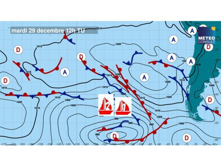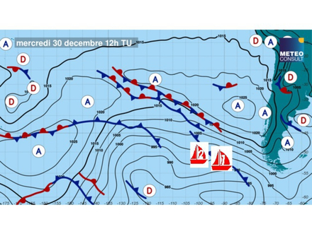 Le duo de tête profite toujours des vents portants de secteur ouest pour progresser sous de bonnes vitesses. Comme la veille, il leur faudra optimiser l’heure du choix de l’empannage principal pour descendre cap au sud-est avec en ligne de mire le cap Horn dans quelques jours. Le groupe derrière dans les mêmes conditions, grâce à l’étendue de la dépression qui leur permet de bénéficier de vents d’ouest autour de 25 nœuds.
