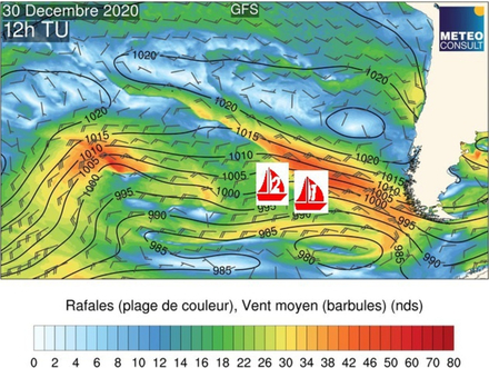 Y. Bastaven et C. Dalin se trouve désormais au nord de la dépression, dans des vents moyens de secteur ouest entre 25 et 30 nœuds mais avec une mer croisée et de vagues de 3 à 4m. La mer est forte et contrariante, mais avec le vent adonnant elle devrait se ranger au fil des heures. Ces vents forts portant, pouvant monter jusqu’à 35 nœuds, favoriseront des vitesses à près de 20 nœuds dans un bord les obligeant à remonter vers le nord-est mais sans trop empanner.
