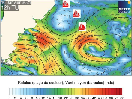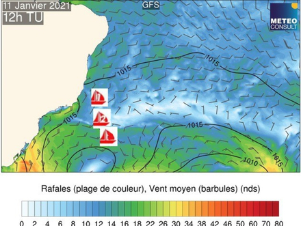 La carte de champ de vent montre qu’un flux de nord-est faible et irrégulier concernera le leader de la course. Avec un vent qui viendra de l’avant du voilier, il faudra tirer des bords et rallonger une route déjà bien longue… Les poursuivants décalés vers le sud profiteront d’un vent d’est plus soutenu et pourront espérer grapiller encore quelques milles.