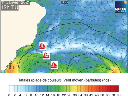 La carte du champ de vent met en évidence le terrain de jeu plus favorable pour le leader que pour ses poursuivants qui doivent encore faire face à de faibles conditions de vent au passage de petites bulles anticycloniques. Il reste néanmoins encore un peu de chemin pour retrouver la route des alizés de sud-est qui permettra de progresser au portant vers la zone équatoriale et le Pot au Noir.