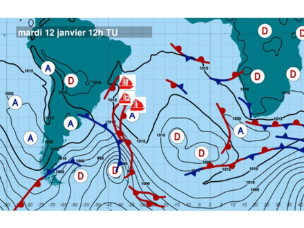 Entre un anticyclone et une petite dépression qui se creusera sur la frange côtière du Brésil, Y.Bestaven profitera d’un petit regain de vent avec un flux de nord-est d’une dizaine de nœuds qui lui permettra de reprendre de la vitesse. C’est une remontée au prés serré qu’il l’attend au large des côtes nord du Brésil. Ses poursuivants devraient progresser un peu moins rapidement, étant moins bien positionnés par rapport à la dépression située au large du Brésil.