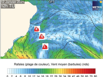 C’est un vent de nord à nord-est très irrégulier et pas très soutenu qui soufflera sur la route du leader. Cette situation météo s’annonce compliquée avec un risque de subir quelques heures très ralenties. Les poursuivants un peu plus décalés vers le sud-est auront un peu plus d’air dans une bordure anticyclonique plus régulière. L’avance de Bestaven pourrait donc un peu plus se réduire. Décidément rien n’est joué dans cette course qui risque bien de connaître des rebondissements…