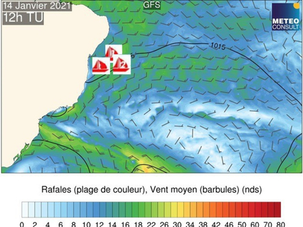La carte de champ de vent montre bien le couloir de vent de nord-est s’établissant au sud de l’isobare 1015 hPa. Cela leur permet de remonter vers le nord sur un long bord, en direction de Recife. Il s’agira d’une navigation au prés (vent venant de l’avant du bateau), tribord amure (vent venant de la droite du voilier) dans une mer qui restera peu agitée. Le classement restera très serré pour ce gros peloton de tête car il n’y aura peu d’options.