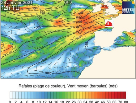 Chaque jour, un expert en météo marine de METEO CONSULT analyse et décrypte la situation météo et son évolution pour les skippers de l’édition 2020-2021 du Vendée Globe. C’est une lutte acharnée à laquelle se livrent les 3 premiers concurrents du Vendée Globe au large du Cap Finisterre ce mardi matin. Au cours de la nuit dernière C.Dalin a creusé l'écart avec son poursuivant L.Burton en prenant une route plus à l'est et donc plus proche de la trajectoire directe vers les Sables d'Olonne. Mais le suspense reste entier car L.Burton sera mieux positionné pour la fin du parcours lorsque le vent de sud-ouest va se renforcer et qu'il se situera plus au nord que ses deux concurrents C.Dalin et B.Hermann. A noter que le premier à arriver aux Sables ne sera sans doute pas le premier au classement. En effet avec une bonification de 6 heures, le troisième de la course Boris Hermann à 74 milles du leader peut espérer se retrouver sur la première marche du podium (avec une vitesse moyenne de 15 nœuds, il parcourt 90 milles en 6 heures).