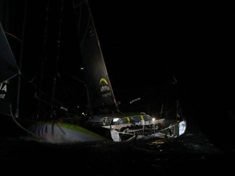 Le 10 décembre, au sortir d’un très fort coup de vent qu’il est le seul à prendre de plein fouet avant le passage du cap Leeuwin, sa vitesse moyenne accuse le coup.