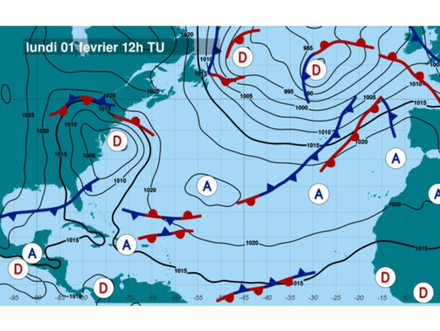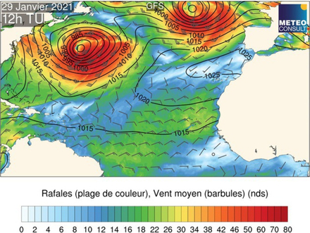 La tempête Justine que l’on voit bien positionnée au sud de l’Irlande à 12TU devrait se diriger l’après-midi vers l’ouest de la France. A ce jour, et bien que sa trajectoire ne soit pas encore totalement fiabilisée, la probabilité d’une tempête dans le golfe de Gascogne est élevée. La carte de situation nous montre également une autre tempête sur l’Atlantique Nord. Cette configuration est propice à générer des vagues de 10 m et des conditions de mers du sud pour les concurrents au nord des Açores et qui remontent vers le golfe de Gascogne.