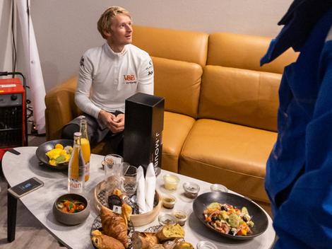 Romain et les autres marins attendaient donc avec impatience leur premier repas après avoir remonté le chenal. Tous ont pu en effet bénéficier d’un bon plat avant ou après leur conférence de presse. Et ils sont nombreux à avoir opté pour de la viande : entrecôte pour Louis Burton, Jean Le Cam et Jérémie Beyou, côte de bœuf pour Romain Attanasio et poulet pour le vainqueur, Yannick Bestaven. Certains ont préféré des pizzas : une « reine » pour Charlie Dalin et Damien Seguin, une « margarita » pour Boris Hermann, une « chèvre » pour Clarisse Crémer.