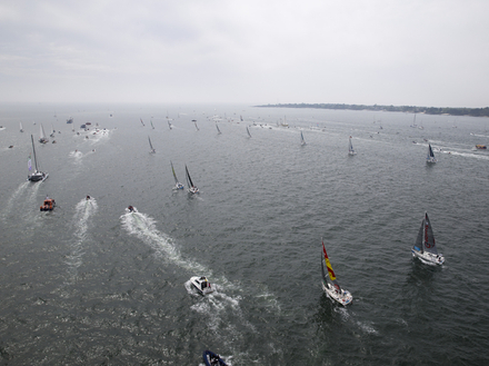Après un départ sous un vent de sud à sud-ouest de l’ordre de 15 nœuds, le vent forcira à une vingtaine de nœuds au large des côtes sud de la Bretagne avec une mer qui deviendra rapidement très forte avec des vagues de plus de 4 mètres. Dans la soirée et la nuit, le temps deviendra de plus en plus instable avec le passage de fortes averses appelées « grains » en météo marine. Avec la présence d’air de plus en plus froid en altitude, les averses pourront localement prendre un caractère orageux et s’accompagneront de brusques rafales de vent qui pourront atteindre 35 à 40 nœuds. Autant dire que les marins seront mis à rude épreuve d’entrée de jeu sur cette Transatlantique… Ces conditions météo nécessiteront de nombreuses manœuvres et réglages de voiles qui laisseront bien peu de temps de repos aux navigateurs.