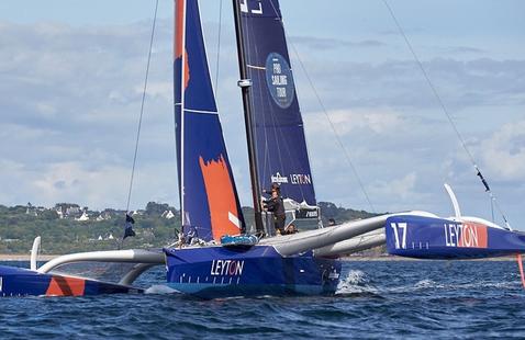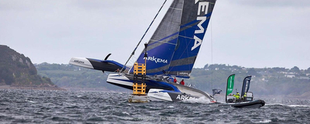 Ça se dégrade en rade. Derrière, Solidaires En Peloton-ARSEP (Thibaut Vauchel-Camus) tire aussi les bénéfices de ce rebondissement de dernière minute dans les ultimes longueurs de ce côtier dominical. Il s'adjuge une belle deuxième place au terme de ce côtier qui rapporte de précieux points au classement général. Sur l'eau, les conditions ne font désormais plus mentir les prévisions. Ça se dégrade en rade. Le vent fraîchit à 25 nœuds et plus et menace de redoubler d'ardeur alors que les Ocean Fifty accélèrent déjà avec des pointes à 34/35 nœuds mesurés d'un bord à l'autre. La houle qui rentre fort depuis le goulet de Brest indique qu'après cet ultime côtier et 1h20 de course, il est plus sage de rentrer au port.