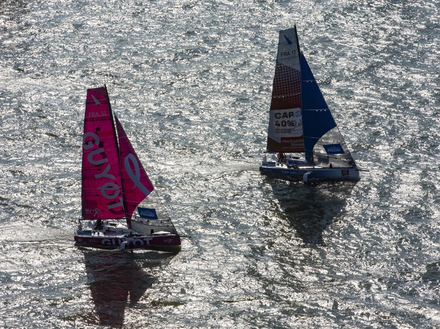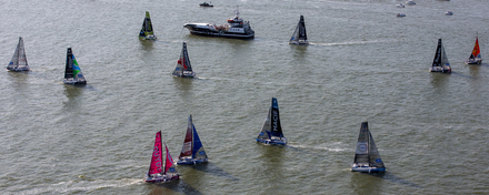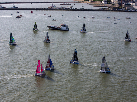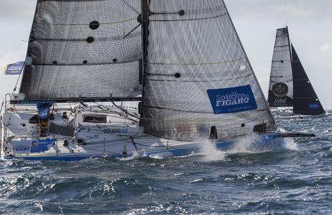 Signe du mors au dent qui anime l'ensemble de la flotte, le départ initialement prévu à 17 h 45 a été légèrement différé pour cause de rappel général, trop de concurrents ayant prématurément franchi la ligne. La deuxième tentative a finalement été la bonne. Dans des conditions idéales, au large de l'imposant pont de Saint-Nazaire, Gildas Mahé (Breizh Cola) s'est élancé en tête. Le plus vieux skipper de la flotte (46 ans) devançait alors le bizuth américain Jesse Fielding (Opportunity - States Street marathon sailing), preuve si l'en était besoin que skippers expérimentés et nouveaux venus ont tous l'envie et les moyens de défendre leurs chances. Quelques minutes plus tard, c'est finalement Benoit Mariette (Génération Senioriales) qui passait la bouée N°7 en tête (première marque de parcours), devant Elodie Bonafous (Bretagne – CMB Océane) et Tom Laperche (Bretagne – CMB Performance). Dans leur sillage, l'ensemble de la flotte établissait progressivement le grand spi. Au passage de la deuxième et dernière bouée du parcours côtier (Solitaire du Figaro), Tom Laperche faisait parler sa vitesse et prenait provisoirement les commandes de la course. Benoit Mariette restait deuxième devant Elodie Bonafous. Alexis Thomas (La Charente Maritime), Martin Lepape (Gardons la vue),Gildas Mahé (Breizh Cola), Pierre Quiroga (skipper Macif 2019), Damien Cloarec (Saferail), Gaston Morvan (Bretagne CMB – Espoir) et Pierre Leboucher (GUYOT Environnement – Ruban Rose). Il reste désormais un peu moins de 620 milles à l'ensemble de la flotte pour en découdre !