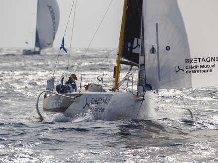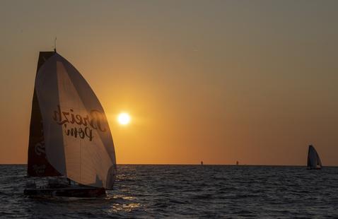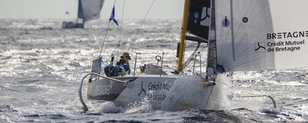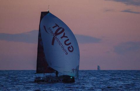 « Pour l’instant, j’ai été parmi les premiers leaders à empanner. Il faut profiter des conditions parce que cette nuit, ça ne va pas être pareil ! Il faut profiter des conditions parce que cette nuit, ça ne va pas être pareil ! Il y avait des dauphins qui nageaient le long du bateau et c’était vraiment sympa. C’est aussi pour cela que l’on vient faire cette course, parce qu’il y a des moments assez magiques quand même. Autant, je n’ai pas pris le temps de faire de petites vidéos au lever de lune, mais je me suis rattrapé au lever de soleil. On a l’impression que c’est simple, mais le vent n’est vraiment pas stable du tout en force et en direction. Il faut régler assez souvent. On voit souvent les gens autour sortir de leur carré pour régler soit le pilote, soit les voiles. Je vais attendre de voir comment cela forcit doucement et j’essaye de trouver de petits moments pour faire la sieste dès que je me sens fatigué. Pour l’instant, j’ai été parmi les premiers leaders à empanner. C’est Corentin Horeau qui a été le premier à déclencher le dernier… Ce jeu de placement est intéressant. En tout cas le vent change pas mal en force, en direction, en pression, ce qui fait que les bateaux se rapprochent et s’éloignent dans un mouvement permanent d’accordéon ».