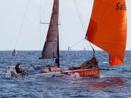 Xavier Macaire (Groupe SNEF) en approche de la marque de Los Farallones : « Il y a de l’eau sur le pont du bateau, du bruit parce que la quille vibre. Je me prends aussi des paquets de flotte sur la mer bien formée. Le jour se lève et cest sympa de démarrer une belle journée avec le passage de cette petite bouée. Cette nuit, on a eu un empannage à faire pour descendre sur lEspagne. On a empanné presque tous en même temps. Puis le vent est rentré et des écarts se sont un peu créés assez rapidement. On a eu 25 nœuds de vent toute la nuit avec des rafales à 30 nœuds. Dans ces conditions, le bateau va vite. J’ai trouvé des bons réglages, et j’ai mis un peu de distance aux poursuivants.