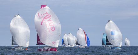 Après un départ dans la baie de Morlaix dimanche à 16h dans de très bonnes conditions, avec une brise de nord-est, la flotte a rapidement pris le large dans un cap au nord-ouest. Malgré un vent irrégulier, ils ont profité de celui-ci pour progresser à 7 nœuds. En soirée, et après une période brumeuse, ils ont poursuivi leur route à 8 nœuds de moyenne grâce à un vent de secteur est également autour de 8 nœuds. Ensuite, le vent est monté d’un cran dans la nuit en prenant un peu de droite vers l’est-sud-est. Cette évolution leur a permis d’augmenter un peu leur vitesse de progression, à l’avant d’un front chaud axé en mer celtique. Malgré la pluie, c’est dans des conditions assez favorables qui l’on retrouvait en fin de nuit la flotte regroupée près de la pointe sud-ouest du Pays de Galles. Mais depuis, les choses ont changé en ce début de matinée. Au vu de l’évolution prévue de la météo pour cette journée, avec ses incertitudes notamment sur la force des vents, deux stratégies se sont clairement définies dans le contournement des zones de DST près des îles Scilly. Trois bateaux ont ainsi opté pour un contournement par le sud alors que le reste de la flotte le fait par le nord. C’est dans des conditions humides, avec de fréquentes pluies, que la flotte va poursuivre sa route ce lundi. Profitant du vent de sud-est se renforçant parfois jusqu’à 15 nœuds ce matin, mais néanmoins toujours aussi irrégulier, les skippers garderont leur trajectoire vers le nord avant de mettre le clignotant en début d’après-midi à l’ouest en direction du Fastnet. Cette après-midi et ce soir, le vent baissera progressivement en même temps que son irrégularité deviendra importante. Les conditions humides persisteront et la mer de sud-ouest lèvera des vagues jusqu’à 1,2m. Cette situation implique une forte vigilance et concentration pour rester devant et être placé pour gérer les prochaines 24h qui s’annonce très délicates et peut-être décisives pour la suite de cette étape finale.