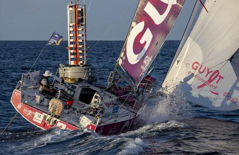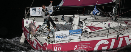 Pierre Leboucher, skipper de GUYOT Environnement - Ruban Rose signe une très belle étape. Toujours bien placé dans le paquet de tête, à l’affût, Pierre effectue, mercredi, un premier recalage au nord, proche de l’orthodromie. Il privilégie, enfin, ce matin, l’option à terre pour bénéficier du thermique et imprime une trace quasi parfaite sur la fin du parcours.