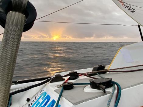 "Les nouvelles ne sont pas fameuses. Alors que nous commencions à rêver d'un retour aux avant-postes grâce à notre bord de reaching rapide à l'ouest et la pétole qui allait bloquer les premiers Class40, nos espoirs ont été stoppés net par une avarie irrémédiable. Le bout-dehors a littéralement explosé sous la pression du gennaker alors que nous marchions à près de 20 nœuds dans un vent mollissant, mais bien aidés par une houle de nord-est. Sans bout-dehors, impossible d'envoyer les spinnakers et autre code 0 ou code 5, les seules voiles utiles pour le reste du parcours. La décision a été vite prise. Nous faisons demi-tour et abandonnons donc la course. Nous nous dirigeons maintenant vers le nord et le détroit de Gibraltar, distant de plus de 1000 milles. Il nous faudra sans doute une bonne semaine. Nos pensées vont à nos partenaires, nombreux, qui nous ont soutenus sans relâche depuis le début de la saison. L’aventure continue. Nous continuerons à vous envoyer nos mots du bord, nos photos et vidéos. La déception est grande, à la hauteur de l'énergie de toute l'équipe depuis des mois pour optimiser le bateau, mais il faut accepter ces coups du sort… Ce n'est pas le premier et malheureusement pas le dernier... Le retour, face au vent, ne va pas être drôle mais on fera avec."