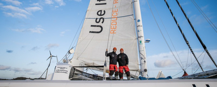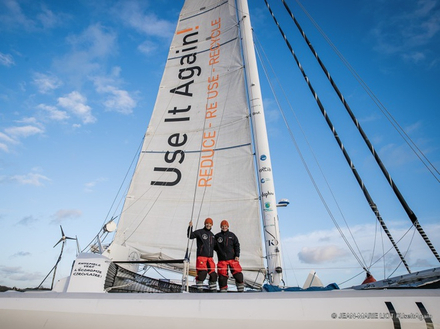 Le trimaran Use It Again!, l’ancien bateau d’Ellen MacArthur, reconditionné selon les principes de l’économie circulaire a franchi la ligne de départ à 17 heures 36 minutes et 04 secondes entre le phare de Pen Men sur l’Ile de Groix et le phare de Kerroc’h à Lorient. Ce Tour du Monde contre les vents et les courants dominants n’a encore jamais été réussi en multicoque, un vrai défi sportif pour Romain Pilliard et Alex Pella.