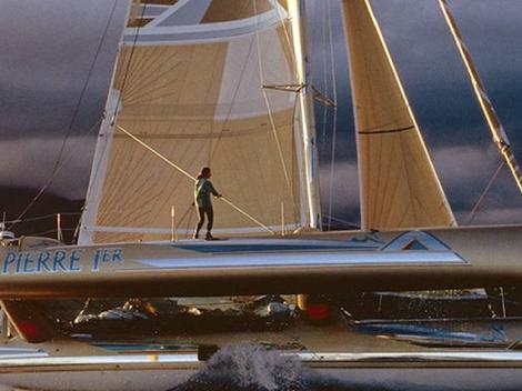 Fin d’après-midi du dimanche 9 novembre 1986, l’hélicoptère qui suit la course depuis le départ va faire demi-tour. En bas, sur l’eau, accroché à la grande barre à roue de son catamaran géant, Loïc Caradec se retourne et salue de la main. L’immense mât aile de Royale le surplombe et l’entraîne malgré lui. C’est la dernière image que nous aurons de lui. Malheureusement je n’ai pas pu faire l’acquisition de cette photo de Christian Février lorsque j’en ai eu l’occasion et je le regretterai toujours. Elle est à la fois magnifique et infiniment triste. Le 13 novembre, Florence Arthaud retrouvera le catamaran retourné, vide. Le gros temps a eu raison du maxi-catamaran mais pas de Philippe Poupon. Prudent septième en 1978, discret 9ème en 1982, il est, quatre ans plus tard, au sommet de son art. Fleury-Michon, sponsor fidèle, lui permet de construire un trimaran sur-mesure, sur les plans du génial Nigel Irens. Avec une préparation rigoureuse, une analyse météo inspirée, le sort en est jeté, deux jours après son arrivée, il n’y a toujours pas de second majesté !