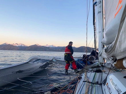 « Il était 1h du matin local quand un grand bruit m’a réveillé en sursaut. Le bateau s’est immobilisé. J’ai de suite compris… Nous prenions la barre à tour de rôle, assurant nos quarts respectifs, en naviguant dans la baie de Cook pendant la nuit pour être en place ce 9 février en vue d’une nouvelle dépression et avant une possible fenêtre de sortie le 10 vers le Pacifique. Les conditions météo étaient encore bonnes, nous étions sous voile réduite, nous progressions à 6 nœuds dans la baie de Cook. Alex était de quart, et c’était mon tour d’être de repos. Après plus d’un mois en mer, la fatigue s’est accumulée et Alex s’est posé à l’intérieur et s’est endormi. C’est un vrai cauchemar ! Je n’ai pas vraiment les mots. Je suis dévasté. J’essaie d’évacuer et de me concentrer sur l’urgence du moment. Mais j’ai du mal à croire ce qui nous est arrivé. À ce moment-là. Dans ces conditions. Le trimaran est littéralement posé sur les rochers, nous sommes coincés dans un trou de souris avec des rochers tout autour de nous. C’est surréaliste d’être là. De vivre ça. Après ce que nous avons traversé ces derniers jours. Nous avons préparé le bateau pour sortir d’ici, envoyé une vidéo à la Marine Chilienne pour qu’ils puissent nous sortir de là dans les meilleures conditions et le plus rapidement possible avant l’arrivée de la dépression et sans trop abîmer le bateau. La zone n’est pas cartographiée, la sortie va être compliquée. Nous ne sommes pas blessés, nous allons sortir le bateau de là, le mettre en sécurité, la suite on verra.» confit Romain Pilliard.