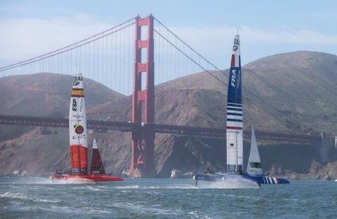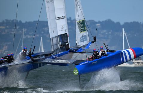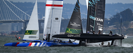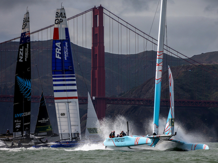 Sous un ciel chargé et dans des conditions de vent erratiques, les 8 équipes ont attaqué la dernière journée du Grand Prix de San Francisco sur les chapeaux de roues, dans une brise oscillant entre 16 et 25 nœuds. Aile intermédiaire de 24 mètres, petits foils et petits safrans, c'est dans une configuration identique à celle d'hier que la flotte du SailGP s'est élancée.
