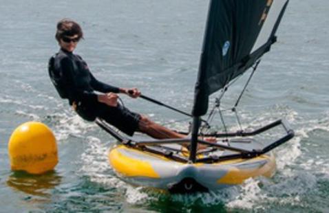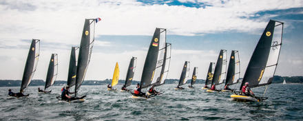 Au briefing du matin, alors qu’une légère brume enveloppe encore le décor de carte postale de la base Nautique de Toulindac, un fan de la première heure se souvient. Il y a dix ans, pour la première édition, ils étaient six. Dix ans plus tard, nous sommes soixante ! Le compte est bon et illustre parfaitement la success-story de ce dériveur pas comme les autres diffusé depuis à plus de 2 200 exemplaires. Sur la plage les sacs jaunes et noirs sont alignés, car tout commence par un concours de montage. Le ton est donné, on est ici pour naviguer mais surtout pour s’amuser. Certains se piquent au jeu et le record est explosé, 7 minutes et 26 secondes pour gonfler le bateau, monter la structure alu, le mât, et gréer la voile ! Le commun des marins mettra plutôt une vingtaine de minutes, comme promis par la brochure. Il y a là une très grande majorité de « T3 », le Tiwal original. Il a été rejoint depuis par le « T2 » avec des ailes non plus en alu, mais gonflables, et le « T2L », le même en plus grand, capable d’accueillir deux adultes ou un adulte et deux enfants confortablement. Le « T3R », ultime version ultra-performante du modèle originel, alimente de nombreuses conversations, mais il n’est pas encore présent, seulement disponible à l’essai le lendemain pour les plus impatients.