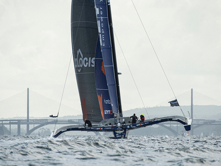 300 milles en moins de 18h : les chiffres valent mieux qu’un long discours. Comprenez que les Ocean Fifty ont « tartiné » souvent à des vitesses hallucinantes sur ce grand tour de la Bretagne : entre 30 et 35 nœuds au max, 25 le plus souvent. Le vent de sud-ouest tonique et la grosse mer leur ont demandé une certaine prudence notamment aux abords d’Ouessant, mais n’ont pas empêché les cadors de la voile d’attaquer et de faire marcher leur monture à 100% de leur potentiel. Leyton a donné le ton d’emblée : voilure maximum, qui m’aime me suive ! Une cadence infernale que Primonial et Arkema acceptaient de bonne grâce. Mais ce « Défi 24h en Finistère » a connu quelques péripéties notoires : Solidaires En Peloton-ARSEP cassait son grand gennaker avant la nuit, et terrible coup du sort, Koesio tombait en panne sèche d’électricité quelques minutes après le départ de Brest… Groupe GCA-1001 Sourires, jouant la prudence au maximum et la navigation « en bon marin », se retirait de la course dans la matinée, probablement hors temps dans tous les cas, s’il avait rejoint la ligne d’arrivée. N’empêche, le constat est clair : malgré les pépins du bord, les écarts sont incroyablement minimes, comme les 6 mn qui séparent Solidaires En Peloton-ARSEP de Koesio. Vous avez dit régate au contact ?
