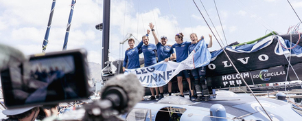 Alors que le vent monte à une douzaine de nœuds sur le coup de midi, Kevin Escoffier et son équipage font preuve d’une grande maîtrise tactique en restant toujours entre leurs adversaires et la ligne. Lorsqu’ils déclenchent leur dernier empannage ils ont réussi à de bâtir un petit matelas d’avance de deux milles sur 11th Hour et Biotherm. Il n’y aura pas de renversement de situation et Holcim-PRB passe la ligne en tête à 13h11 UTC. C’est une deuxième victoire pour le bateau battant pavillon Suisse dont l’équipage très international toujours mené par Kevin Escoffier, était sur cette étape, composé du Britannique Sam Goodchild, de l’Allemande Suzann Beucke, du Français Tom Laperche et de la Néo-Zélandaise Georgia Schofield en reporter embarquée. L’ayant déjà emporté à Mindelo au Cap-Vert, le bateau vert et bleu conforte son avance au classement général avec dix points marqués sur dix possibles avant de s’attaquer au Grand Sud.