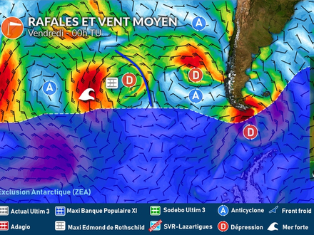 La décision de ralentir et d'attendre le passage de ces deux dépressions est donc la meilleure stratégie pour Charles Caudrelier. L'occasion de reprendre des forces, de soigner son bateau bien engagé depuis trois semaines et d'être prêt à reprendre la route directon Brest. Nous suivrons de près avec METEO CONSULT l'évolution des conditions météo.