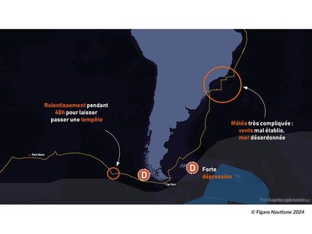Sur l'est du Pacifique, Charles Caudrelier ralentit subitement et doit pendant deux jours avancer au pas pour laisser passer une virulente dépression en direction du Cap Horn. Il a suffisamment d'avance pour pouvoir modérer son allure et préserver à tout prix son matériel. Après le passage du Cap Horn, la situation météo reste compliquée puisqu'il doit trouver un passage étroit entre la zone des glaces et les dépressions qui restent très actives à cette latitude.