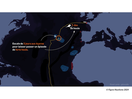 Alors que la remontée de l'Equateur vers les Açores n'a pas posé de problème, le timing météo n'est pas le bon au nord de l'archipel. Une dépression très creuse circule au large des Iles Britanniques et génère une grosse houle sur le proche Atlantique. Impossible de s'en extraire, Charles Caudrelier décide de faire une escale aux Açores pour laisser passer cet épisode de grosse mer qui pourrait mettre à mal son bateau dans les derniers milles à parcourir. Son avance sur Thomas Coville est suffisante pour pouvoir s'octroyer cette escale. Il repartira à la mi-journée du samedi 24 février dans un bon timing pour passer derrière la dépression et rejoindre Brest à 8h37 le mardi 27 février sous une météo des plus clémentes.