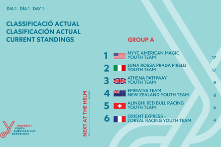 Après un long retard dans l'attente de l'arrivée du vent, la première course de l'UniCredit Youth America's Cup a débuté à 17h38 CET alors qu'une brise de sud-est s'infiltrait et que les bateaux se mettaient à déjauger.