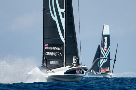 Tout se joue maintenant sur l'exécution des manoeuvres, et à la dernière porte, les États-Unis (USA) abattent à 42 noeuds en tête après un superbe appel sur la layline tribord depuis la limite droite. GBR a réalisé de gros gains en naviguant intelligemment au centre du parcours et se retrouve clairement en deuxième position, tandis que l’Italie (ITA) remonte en troisième place. Un petit splashdown des USA rend la situation extrêmement serrée alors que GBR choisit la layline tribord et que les USA partent sur la layline bâbord.