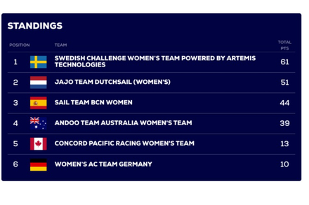 Avec une grande avance de plus de 600 mètres alors que le vent faiblit à la marque au vent, SWE a un delta de 1 minute 33 secondes sur ESP. NED arrive en troisième, avec un retard de 22 secondes. SWE navigue à travers les rafales complexes sur le parcours et ne commet aucune erreur, empannant vers l’arrivée sur la ligne bâbord. C’est une victoire dominante, et SWE prend la tête du classement général. Deux victoires sur deux.