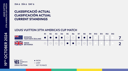 ETNZ empanne à la limite droite avec une avance de plus de 300 mètres et se prépare pour une fin spectaculaire, naviguant rapidement vers la gauche du parcours et repérant les zones de pression en aval. Les deux bateaux minimisent les manoeuvres, et ETNZ navigue vite et en douceur vers la layline bâbord avant d’empanner et de se diriger vers la ligne d’arrivée.