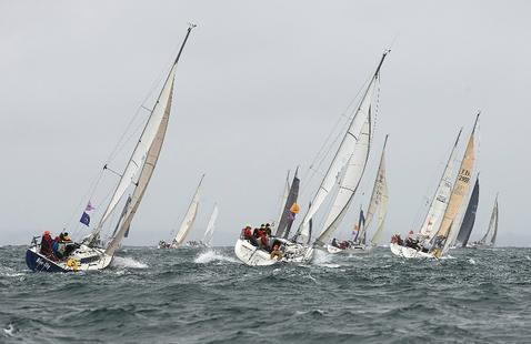 L’une des spécificités du Tour de Belle-Île, c’est son départ unique, ajusté chaque année en fonction du nombre de bateaux. L’ensemble de la flotte s’élance à 10h précises de la Trinité-sur-Mer, dans un alignement impressionnant.