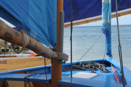 Alain Foy : Non, pour le bois nous utilisons du pin d’Oregon, de l’acajou (blanc, rouge) voire des bois locaux comme le poirier. Le bois doit être parfaitement sec pour être imperméable. Pour cela, nous le séchons dans notre atelier sous des tôles. Pour ne pas alourdir le canot, le bois doit être léger, l’idéal est de le choisir dans un arbre jeune. L’assemblage se fait non pas par calfatage comme sur les Doris bretons mais par collage avec de la colle époxy. La bôme (appelée guy sur un canot saintois) est réalisée en bambou, quant aux coulisseaux de grand’voile (bagues), ils sont en liane ou en rotin. Pour les voiles, pas de maîtres voiliers spécifiques, toutes les voileries sont autorisées à les réaliser à condition que le matériau utilisé soit du coton ou du polyester. Le nombre de poulies de renvoi et de taquets est limité (en principe un maximum de 6 taquets et de 4 poulies). Reste le mât qui est en lamellé collé. Les dimensions d’un canot sont de 5,35 m de longueur et de 1,80 m de largeur. Quant au poids, il est voisin de 160 kg. Pour qu’un canot porte le nom de saintoise, il doit être fabriqué dans les îles de Guadeloupe.