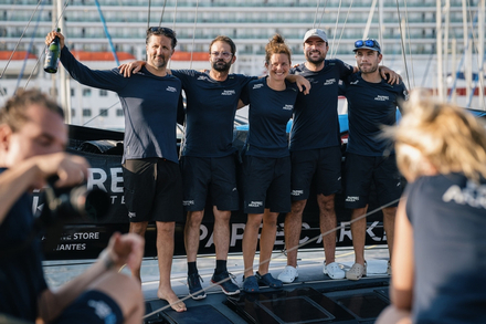Yoann Richomme, Mariana Lobato, Pascal Bidégorry, Corentin Horeau et leur OBR Julien Champolion ont coupé la ligne à 8h38 ce samedi matin après 5 jours, 14 heures, 37 minutes et 41 secondes.