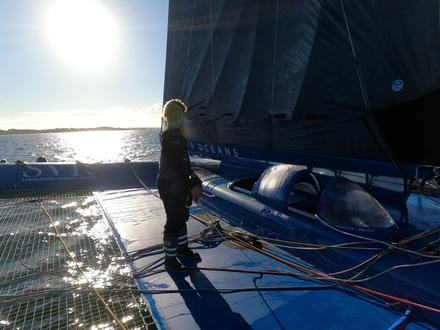 Tout avait pourtant commencé comme une matinée presque ordinaire. Café-croissant dans les superbes locaux de Mer Concept face aux remparts de Concarneau. La météo s’annonce magnifique même si le vent paraît faible, une crainte qui s’avérera vite hors de propos. Nous sommes drivés jusqu’au ponton par Cécile Andrieu, Directrice du Team SVR-Lazartigue (Sciences-Po et Mini-Transat, un combo parfait pour manager ce Google de la Course au Large) où l’équipe technique prépare l’immense trimaran bleu. François Gabart est accueillant, disponible, souriant, semble calme et serein à cinq semaines de LA course de l’année. Et à quelques minutes aussi de sortir du port cette impressionnante plateforme sans aspérité de 32 mètres sur 23, alors que tous les pêcheurs amateurs de la baie semblent s’être donné rendez-vous dans le chenal ! Heureusement, deux zodiacs sont là pour aider, tout comme une liaison radio permanente avec l’équipe et, nouveauté, une commande filaire du moteur et de la barre sortie sur le pont. Posté en avant du mât, pouvant passer d’un bord à l’autre, François Gabart voit tout. Dans le cockpit surbaissé, objet du courroux certains de ses concurrents, quatre équipiers s’échinent déjà sur les moulins à café. Car, respect de la jauge oblige, toute manœuvre doit être effectuée à la force des bras, et il s’agit en l’occurrence de descendre le futur foil sous le vent, impressionnante pièce de carbone en L, pesant 400 kg. Puis c’est au tour de la Grand-Voile d’être hissée, pas moins de quinze minutes d’efforts qui justifient à elles seules la présence d’une salle de sport dans les locaux du Team. A la question de savoir combien de temps il mettrait à effectuer l’opération en solitaire, François Gabart répond que tout allant bien, en dehors des prises et renvois de ris, il ne devrait pas avoir à l’effectuer durant la Route du Rhum... sauf aléa technique (bris de latte) comme en 2018.